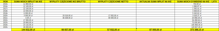 Aktualny bilans wpłat i wypłat oraz wypłaconych dywidend na moim IKE wygląda następująco: