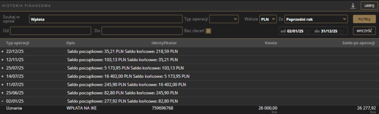 W 2025r. dokonałem kolejnych wpłat na rachunek IKE w wysokości 26 000zł. Aktualna suma wpłat po wypłatach częściowych na moim IKE wynosi 87 tysięcy złotych.